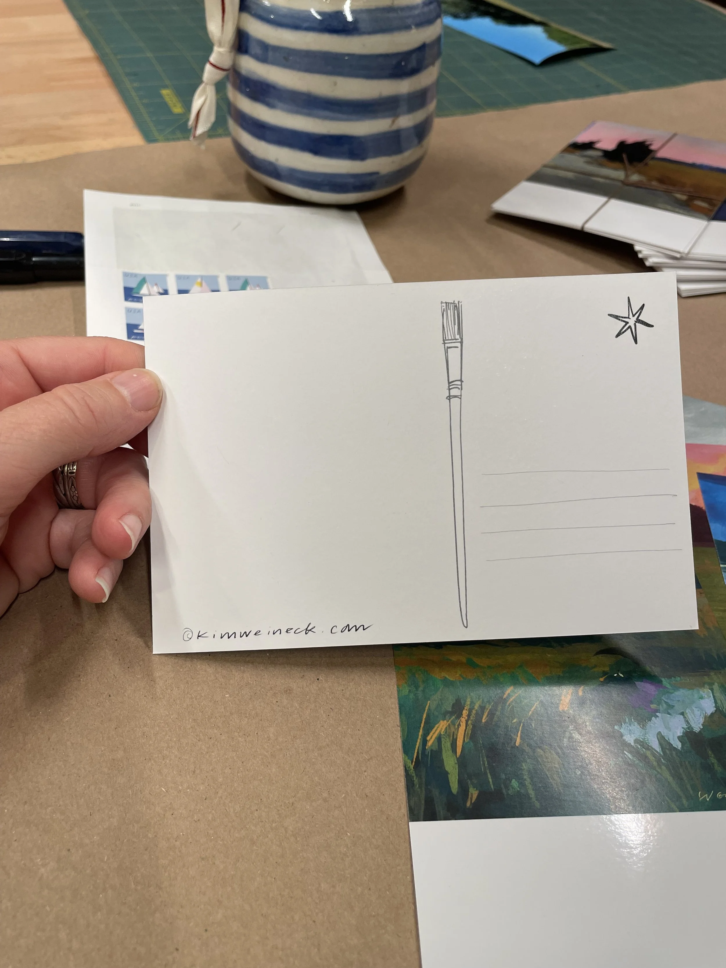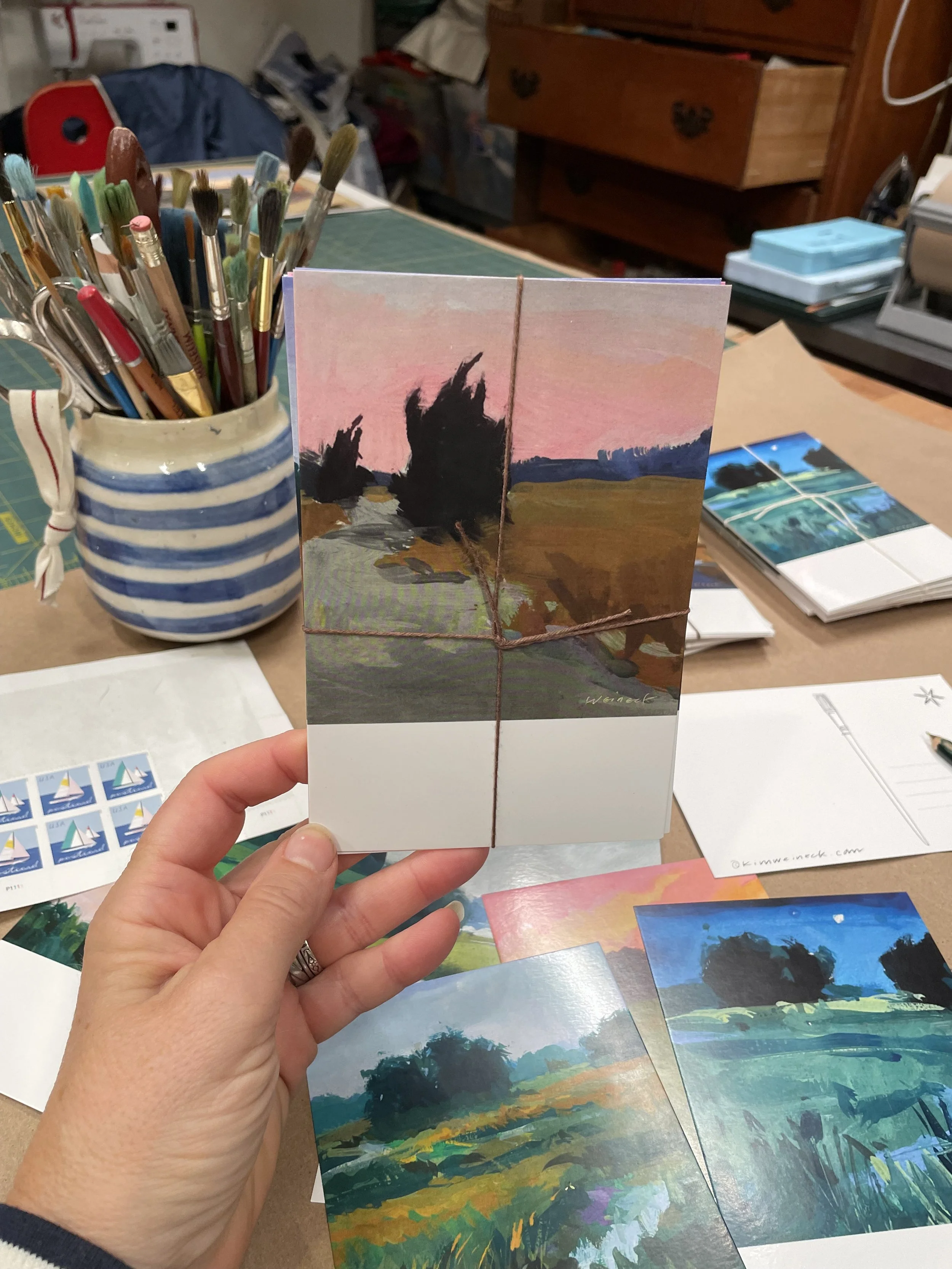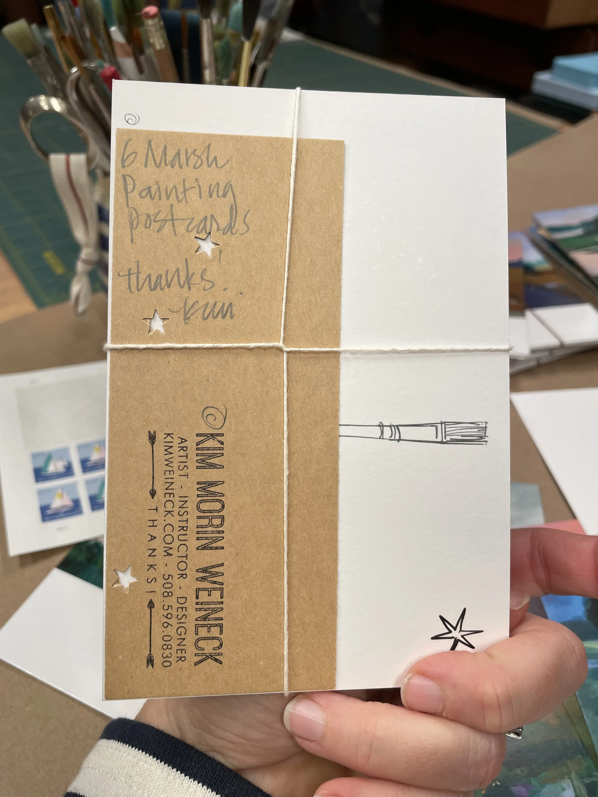 The above photo are postcards of some of my marsh paintings. It was the silliest epiphany for me when I realized I could make postcards of my own work! I have bought and sent the entire box of 100 Pantone postcards (it’s fun to choose just the perfect color to send to someone) and at museums I’ve enjoyed selecting books of postcards by other artists to send to friends. But this? What fun — a postcard from Marsha-Marsha-Marsha!